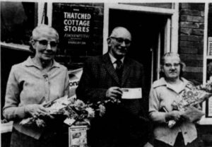 The Thatched Cottage Stores, Finchampstead, which has served the population of the village for 45 years since it was opened by Mrs M. Goswell, is no more. On Saturday afternoon, more than 100 of the villagers went to the store, where presentations were made to the last owners of the shop, who have now retired. They were Miss Marjory Goswell, and her brother-in-law and sister, Mr Graystone Bird and his wife, Nellie. Miss Goswell took over the shop in 1950, when her mother died, and Mr and Mrs Bird came soon after to assist her. Miss Goswell – now 64 – and her younger sister, Nellie, now 62, were born in the village.
