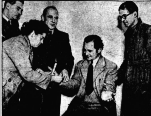 “Right!” said Mr. Leslie Brown, a member of the International Brotherhood of Magicians, a friend of Mr. Fogel’s and an associate of the late Mr. Harry Price, the psychical research expert. “Any more photographs?” The photographers got down on their knees and there were a series of brilliant flashes and cries of “Hold it.”