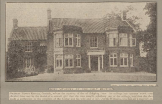 Swanton Novers Rectory, Norfolk, where the mystery of the oil dripping from the ceilings has become more complicated than ever by the denial of a servant girl that she was caught splashing one of the ceilings, and that she then made a confession in the presence of the Rector and his wife and of Mr Oswald Williams, who had set a trap for her.