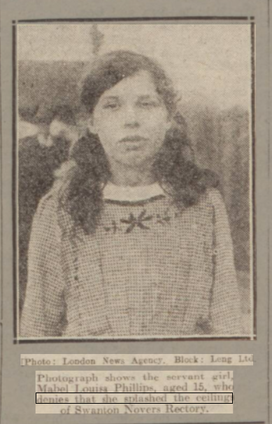 Photograph shows the servant girl Mabel Louisa Phillips, aged 15, who denies that she splashed the ceilings of Swanton Novers Rectory.