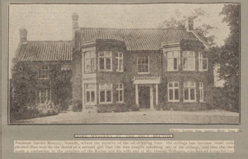 Swanton Novers Rectory, Norfolk, where the mystery of the oil dripping from the ceilings has become more complicated than ever by the denial of a servant girl that she was caught splashing one of the ceilings, and that she then made a confession in the presence of the Rector and his wife and of Mr Oswald Williams, who had set a trap for her.